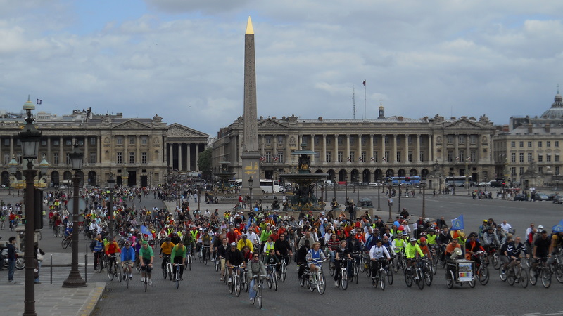 | Magnifique arrivée en 2011 des cyclistes venue de toute l’île de France sur une place de la Concorde débarrassée momentanément de ses bagnoles. |